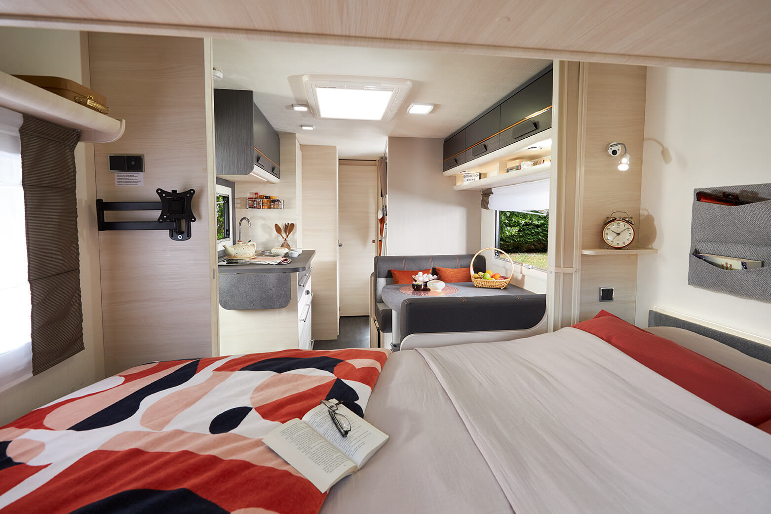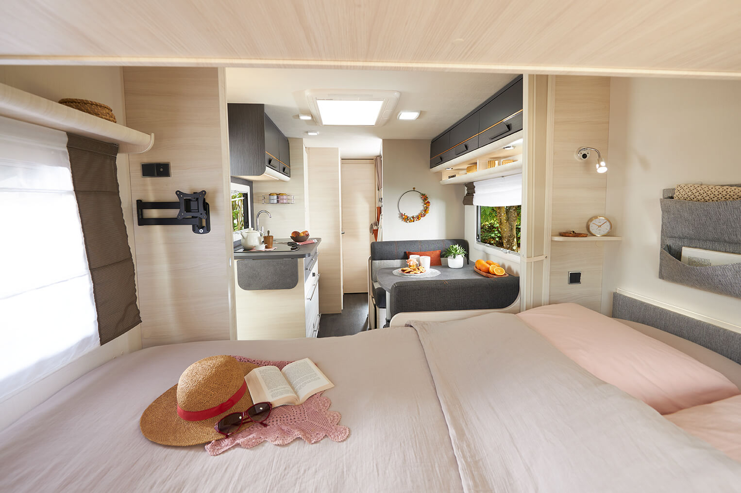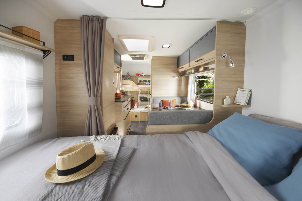 עיצוב פנים חכם ויעיל אשר מעניק תחושת מרחב עשירה וחופש תנועה בין חלקי הקראוון. ריהוט עץ עכשווי בגוון חום בהיר ומשטחים אפורים, מעניקים אווירת מגורים נעימה ומודרנית.